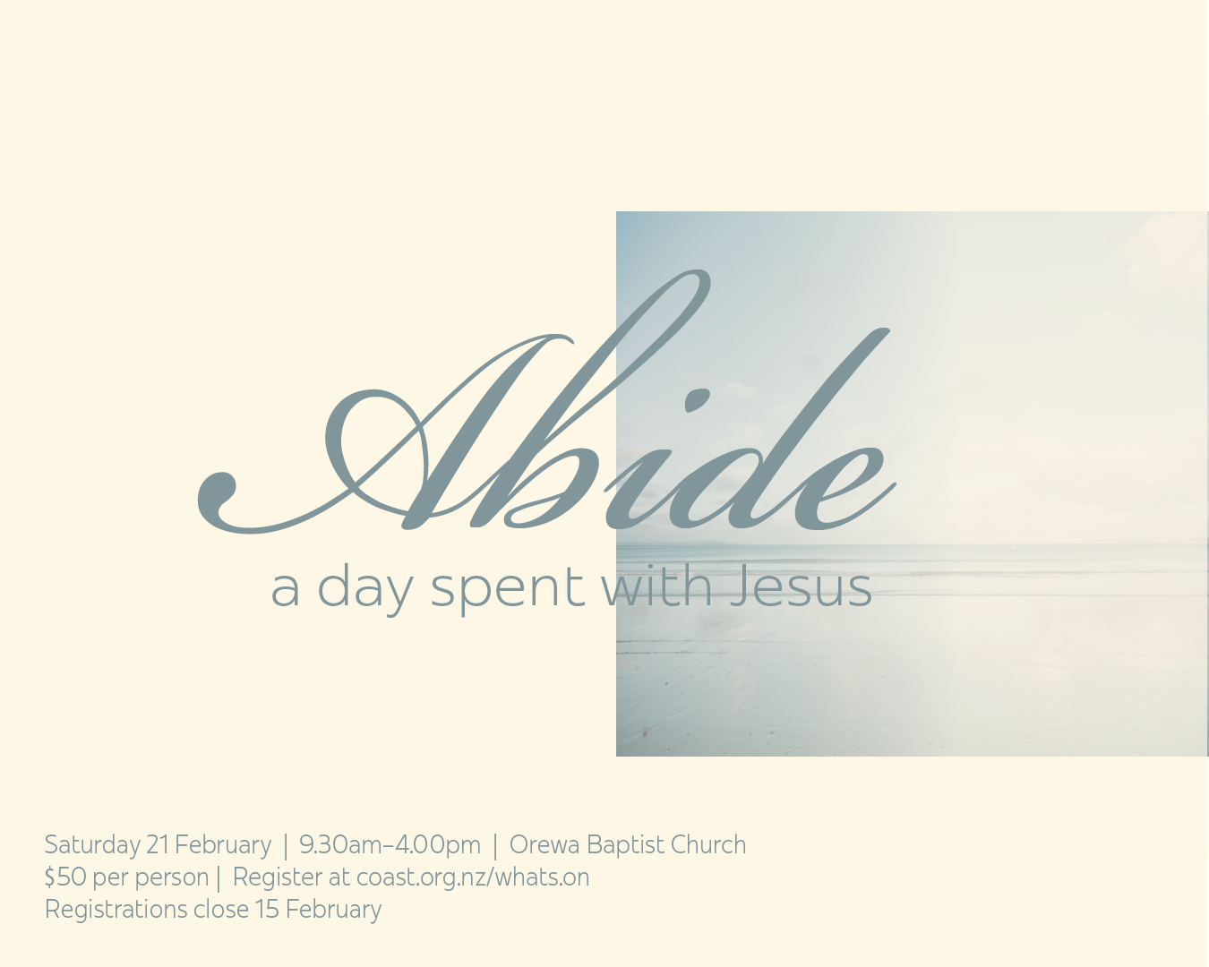 You are invited to ABIDE: A Day Spent With Jesus — a guided Prayer Retreat Day on Saturday 21 February, led by Jacinda Lilly (24/7 Prayer NZ), held at Orewa Baptist Church.